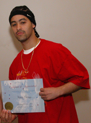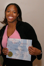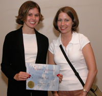 Allison Krull, AS 2006, (left) accepts a certificate of recognition for her participation in the Unity Project from Jamie Jackson, residence life diversity fellow. |