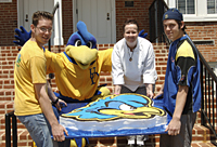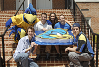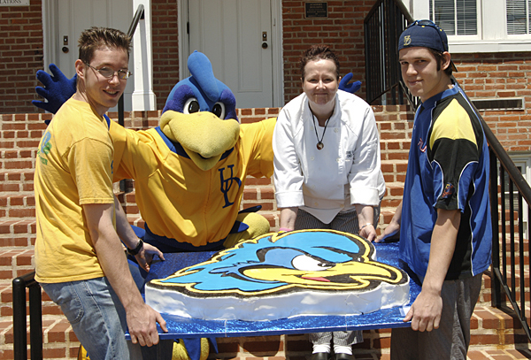 YoUDee has won several awards and trophies for good sportsmanship and mascotship but last week received a different kind of accolade. The big bird was presented with a heroic-sized YoUDee cake at the end-of-the-year picnic sponsored by the Office of Public Relations to honor graduating seniors in the mascot program. YoUDee was speechless (as usual) but performed an excited cakewalk in 28FF sneakers to show appreciation and delight. The cake was the inspiration of sophomore Nicholas Tennant, a hotel, restaurant and institutional management (HRIM) major, who also is a member of the Bakers Dozen, composed of students who wish to learn advanced baking techniques. The group bakes for charitable organizations and groups on campus and also accepts paid individual orders. I wanted to do something special for the picnic and this was a good challenge for our group, Tennant, who said he loves to bake, said. Under the tutelage of adviser Deborah Ellingsworth, instructor in HRIM, approximately 10 students gathered to bake the half-yellow, half-chocolate cake from scratch at Vita Nova. The project took 25 hours from stir to finish, using four ovens, and requiring 10 pans, dozens of eggs, about five pounds of flour, quarts of milk, not to mention sugar and butter. Using a template, YoUDees image was then carved from the cakes and iced and held together with vanilla butter cream and then iced with fondant.