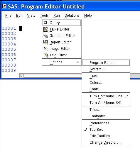 You may customize resources such as colors, fonts, and whether to start the Display Manager (DMS) with the pmenu buttons or command lines. Many of the options may be set by selecting after starting an interactive SAS session with the DMS, as shown in Figure 3.
