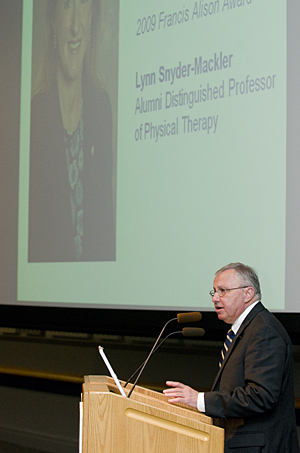Faculty who received special recognition include Lynn Snyder-Mackler, Alumni Distinguished Professor of Physical Therapy, who was recently named the recipient of the 2009 Francis Alison Scholars Award, which is the University's highest faculty honor.