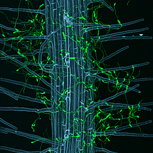 “Maintaining the delicate plant roots while watching the disease process in living samples without damaging them was part of the challenge, as well as coming up with an aesthetically pleasing image,” he says.