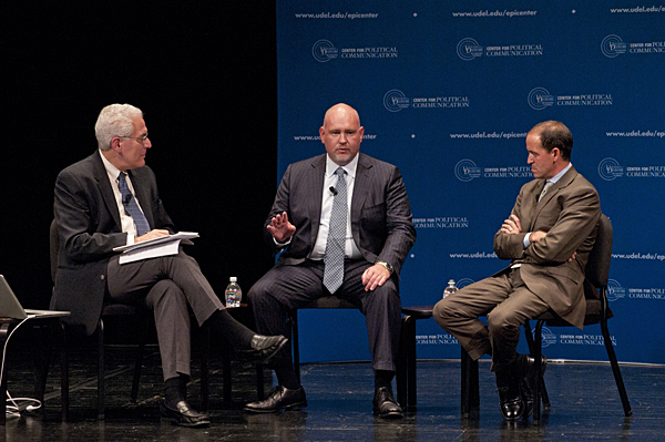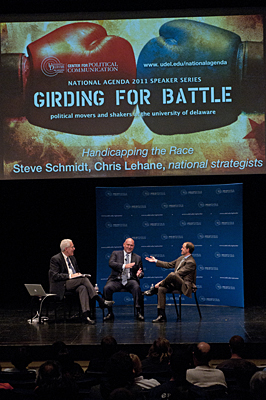 1:58 p.m., Sept. 29, 2011--Handicapping the 2012 presidential race is problematic, two leading political consultants told a National Agenda speaker series audience Wednesday night in Mitchell Hall, because a potential game changer -- Chris Christie, the Republican governor of New Jersey and a University of Delaware alumnus -- remains on the sideline.