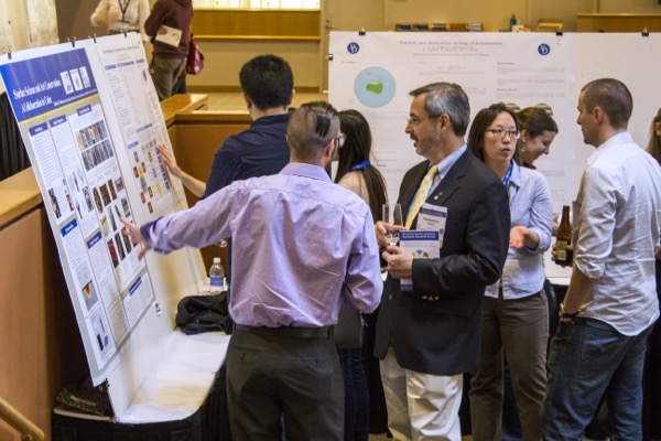 Taken together, they had enormous breadth, too. More than 125 graduate researchers shared their studies of such things as bacterial communication, new ways to monitor the health of bridges, measuring the political significance of social media, understanding face recognition, testing designs for wind farms, developing new ways to evaluate the condition of pipes, helping students gain confidence in calculus, using waist circumference to gauge fitness, the effects of trauma on children in India, using fluorescent labels to understand immune responses in bacteria and a reverent study of early religious texts in Pennsylvania.